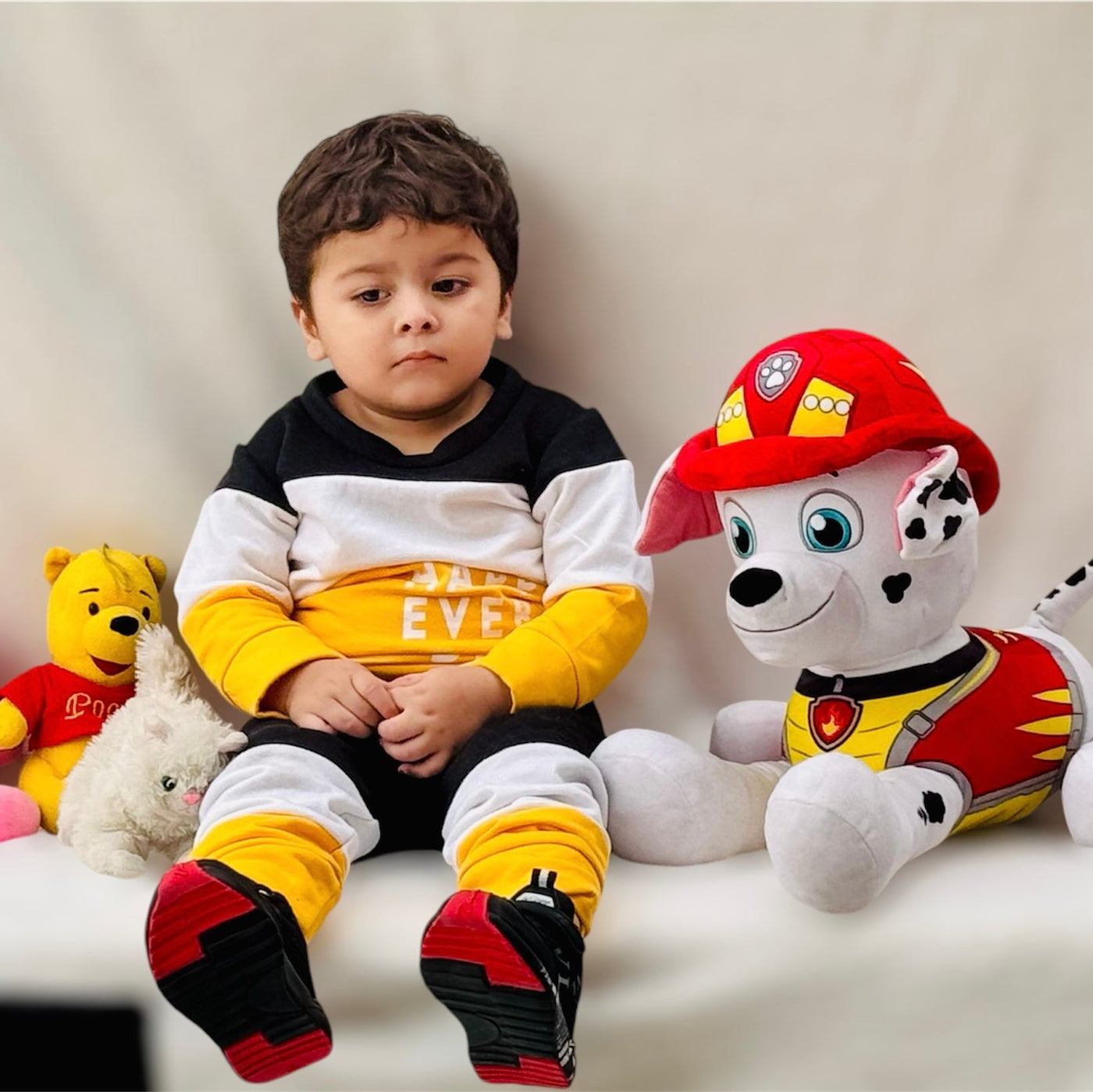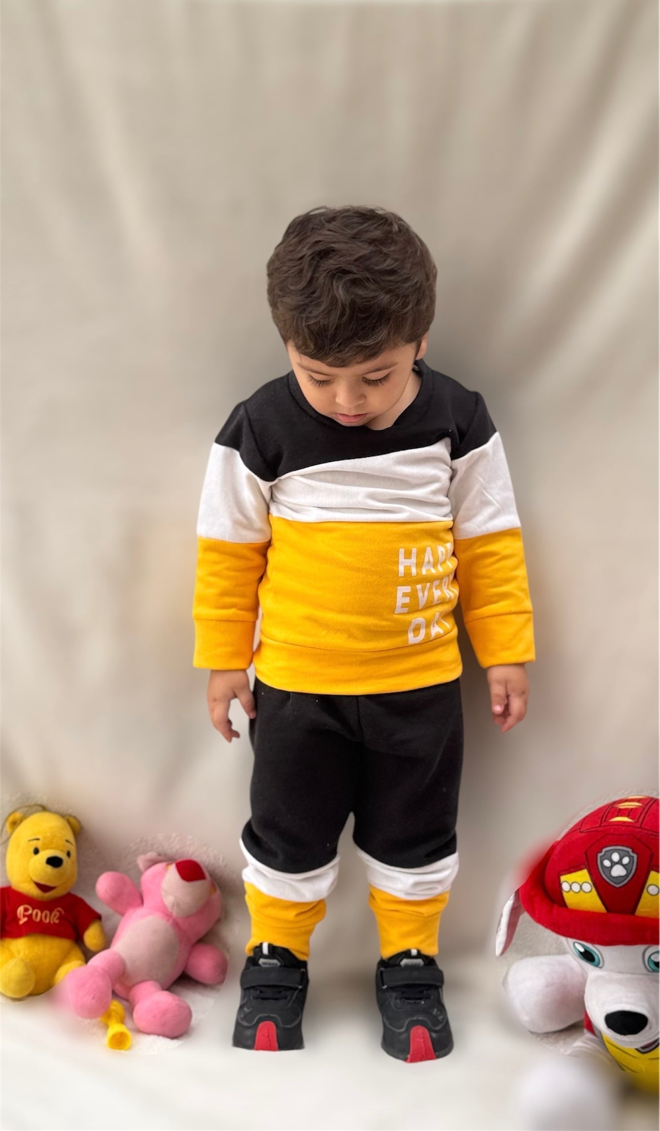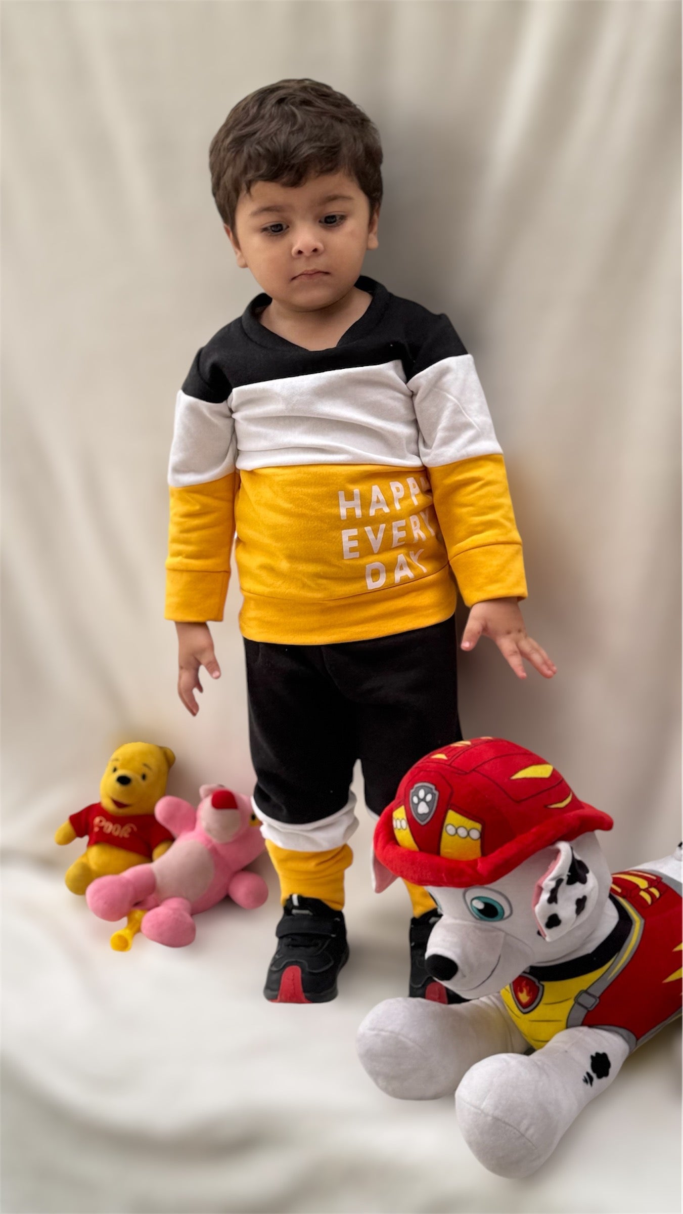 Fleece Fabric Black & Yellow Panel Happy Everyday Printed Kids Winter Suit ( Each ) - 7-8-years